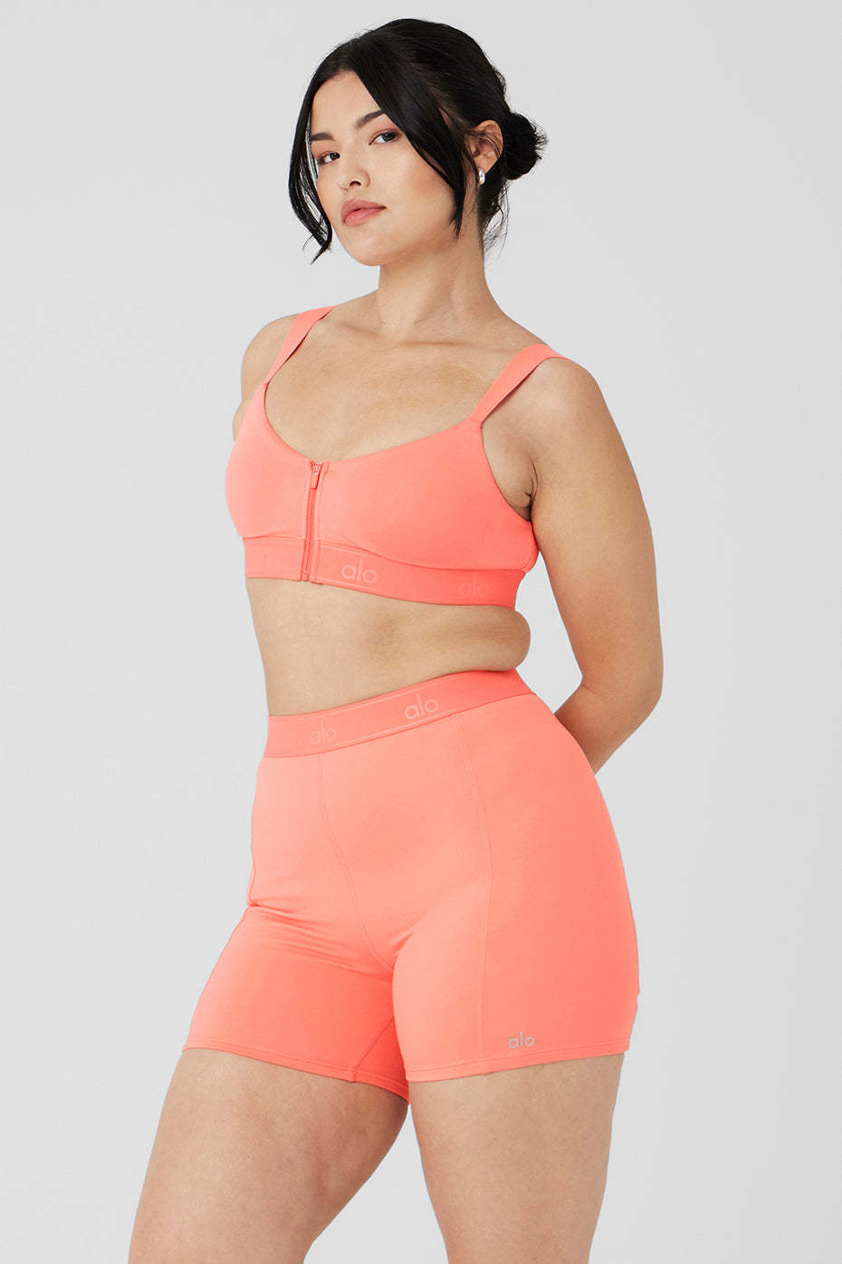 Enter center stage: the athelosoft Molded Showcase Bra. Made with velvety-soft athelosoft fabric, a repeating athelo logo band, and front zipper, this style is perfect solo or layered. The subtle V-shaping on the back and flat, satin elastic straps pair perfectly with the matching athelosoft Showcase Short.
